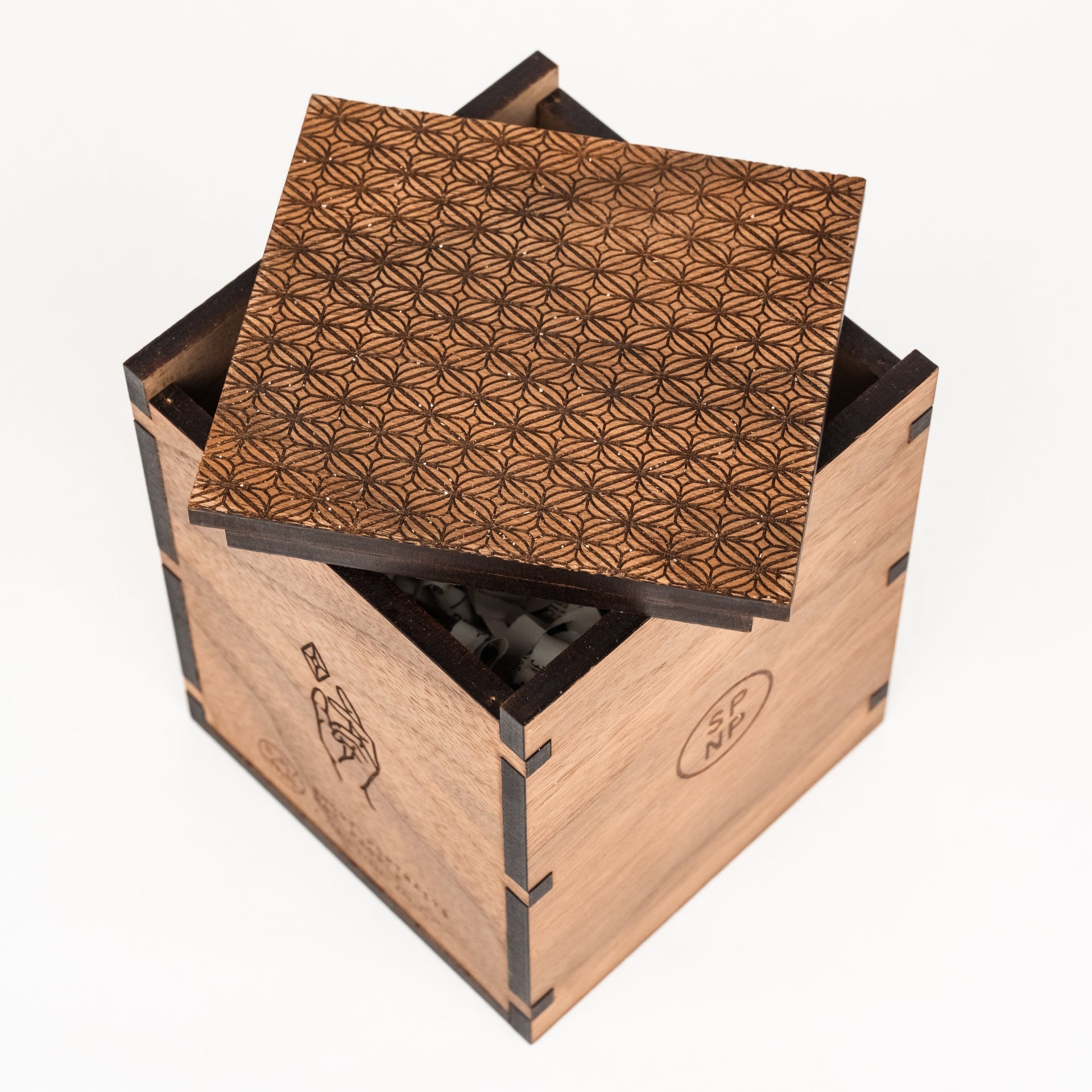 Packaged in a sealed, custom walnut crate, and packed with shredded camera manuals as protective packing material.