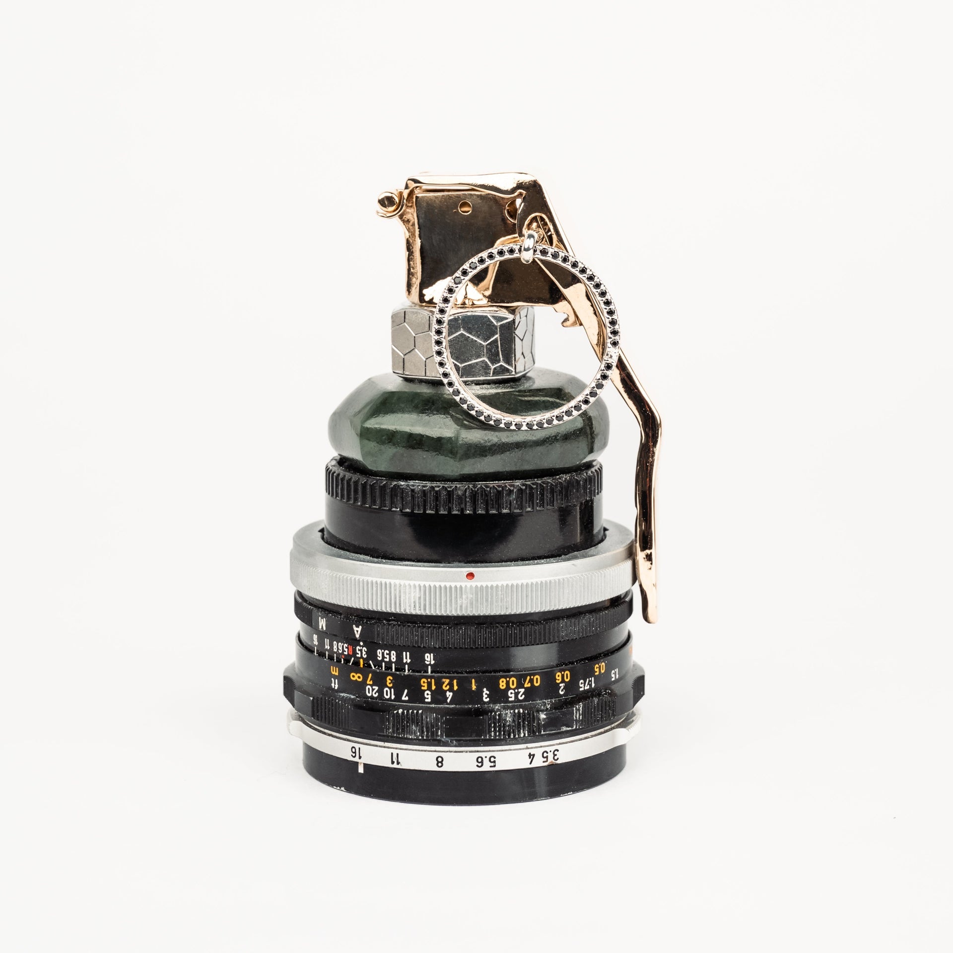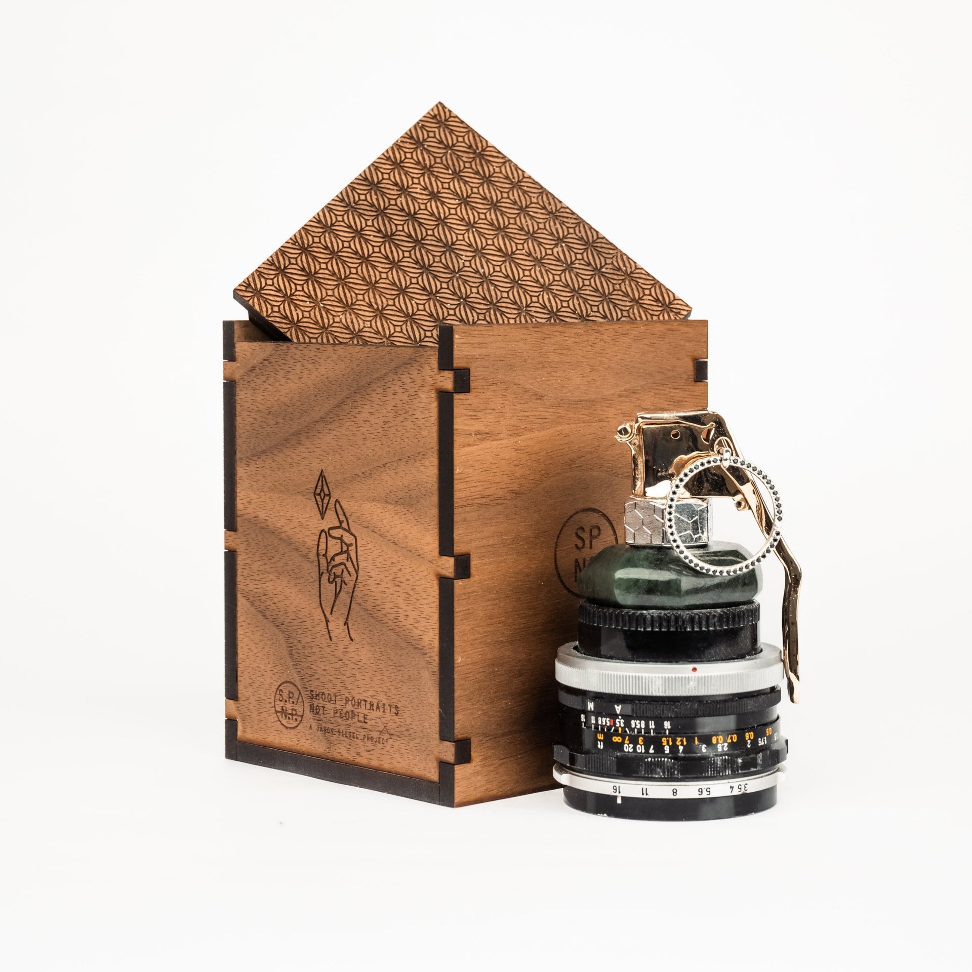 Made from recycled vintage camera lenses and genuine, retired M213 grenade fuses with “Shoot Portraits Not People” laser engraved into the grenade spoon.